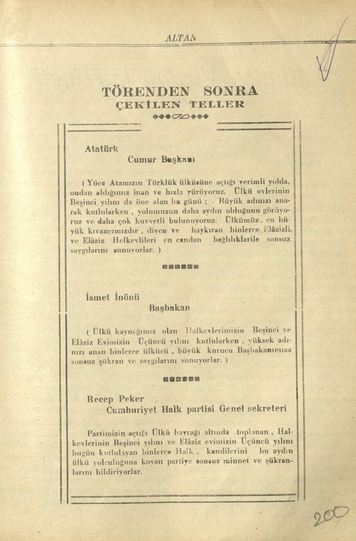 (Partimizin açlığı ülkü bayrağı altında toplanan, Halkevlerinin Beşinci yılını ve Elâziz evimizin üçüncü yılını bugün kutlular binlerce halk, kendilerini bu aydın ülkü yolculuğuna koyan partiye sonsuz minnet ve şükranlarını bildiriyorlar.)