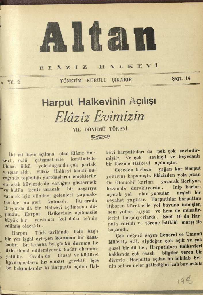 Harput Türk tarihinde belli başı bir yer işgal eyleyen kocaman bir kasabadır. Bu kasaba bu günkü durumu ile dahi ihmal edilemeyecek kadar ehemmiyetlidir. Orada da ulusal ve kültürel kaynaşmaların hız alınası gerekti. İşte bu bakımdandır ki Harput’ta açılan Halkevi Harputluları da pek çok sevindirmiştir. Ve çok sevinçli ve heyecanlı bir törenle Halkevi açılmıştır.